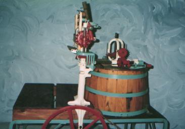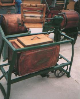 All of the machines pictured, with the exceptions of the "clam shell" Thor and the Maytag with the meat grinder, have been revived. I use the word revive, in lieu of restore, as these machines are not put back to their exact original condition. Each washer was completely dismantled, cleaned, sand blasted, repainted and reassembled. The condition of many machines, as they are found, is, as the antique columnist put it, "little more than junque". Many machines are either completely rusted, covered with decades of hardened grease or have fallen apart to be in several pieces. Of my 608 machines, I have only about a dozen which were found in "museum quality" condition. When painting, original colors were often used on metal parts whenever identification was possible. I do not usually, however, repaint wooden tubs, but instead, refinish them with oil. All but 4 of my 460 revived machines are in working condition. The four are awaiting parts which were either missing or broken beyond repair. It is unfortunate we do not yet have video capability within this magazine,[coming soon!, Dave] so you could more appreciate the inventiveness put into these truly magnificent and dynamic works of art and technology.