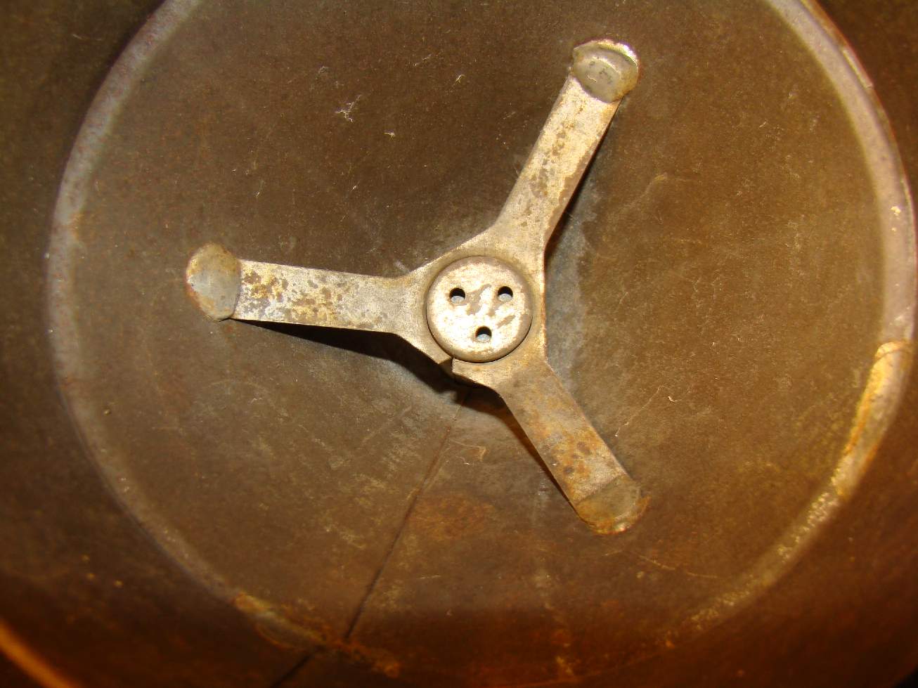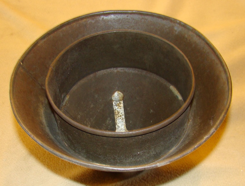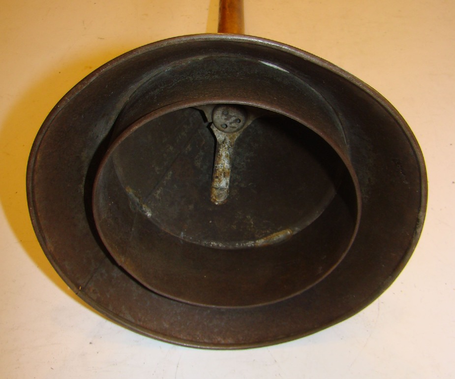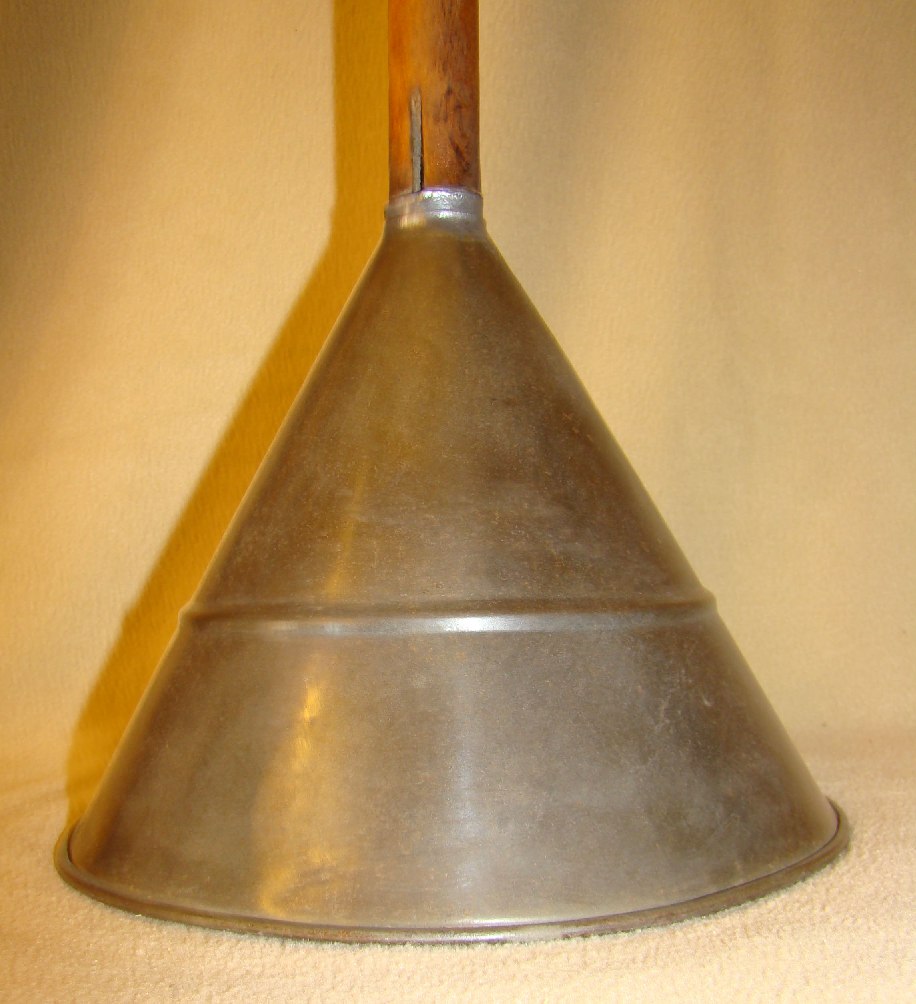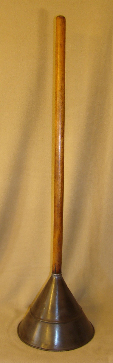 Vacuum washing stomp, tin, has groove in handle to let air into cone |