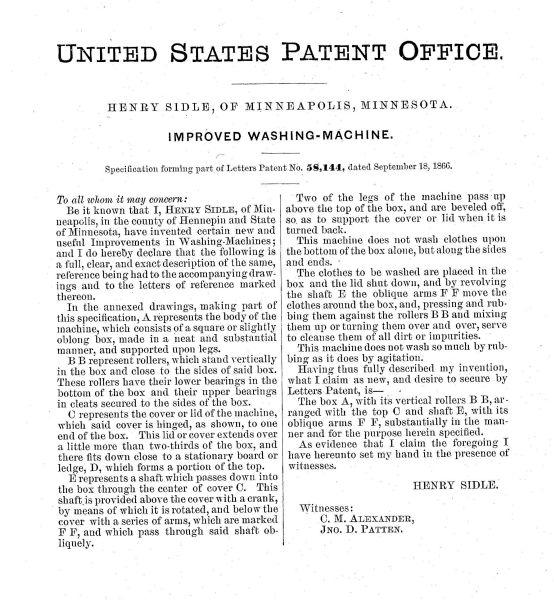 US Pat. No. 58144 Henry Sidle of Minneapolis, MN September 18, 1866