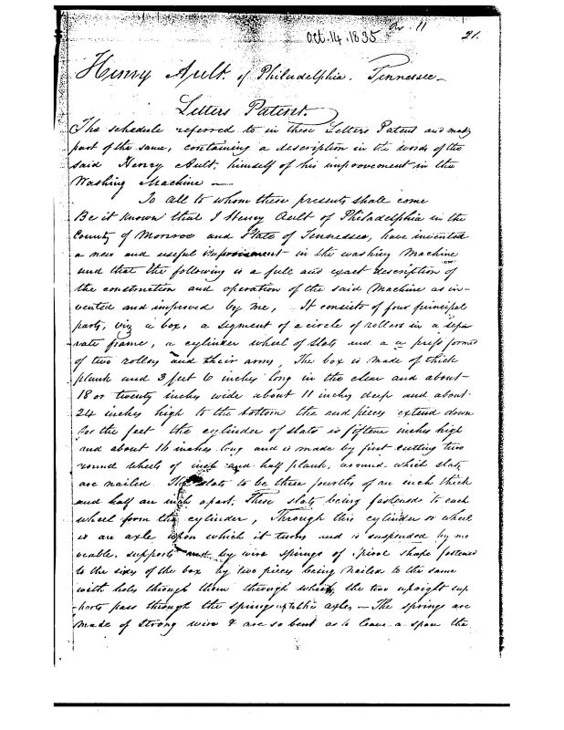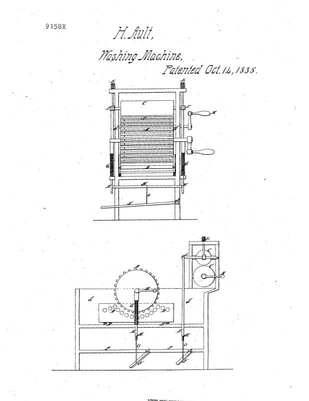 US Patent no. 915X Oct 14, 1835 issued to Henry Ault of Philadelphis, Tennessee. Show with wringer attached