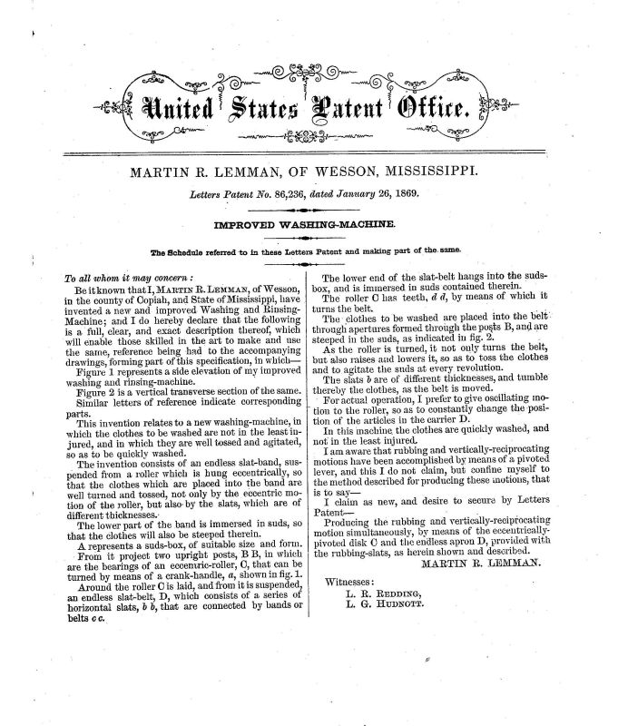 US Pat. No. 86236, January 26, 1869 issued to Martin R. Lemman of Wesson, Mississippi