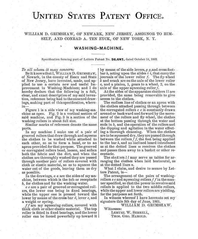 Patent (36687) issued to William D. Grimshaw of Newark, NJ October 14, 1862