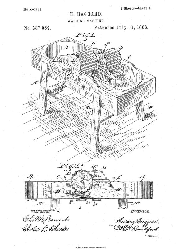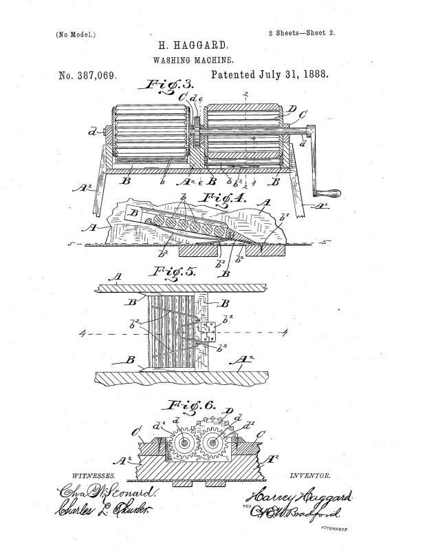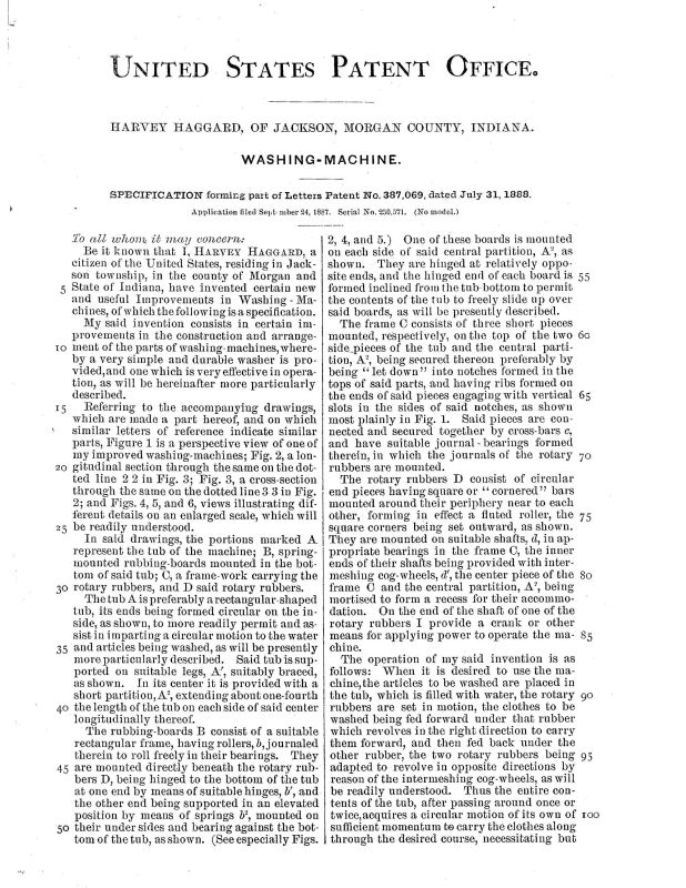Patent (387069) issued to Harvey Haggard of Jackson, IN July 31 1888