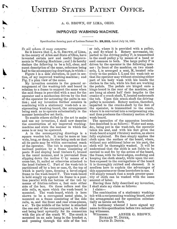 Patent (39212) issued to Abner G. Brown of Lima, OH July 14, 1863