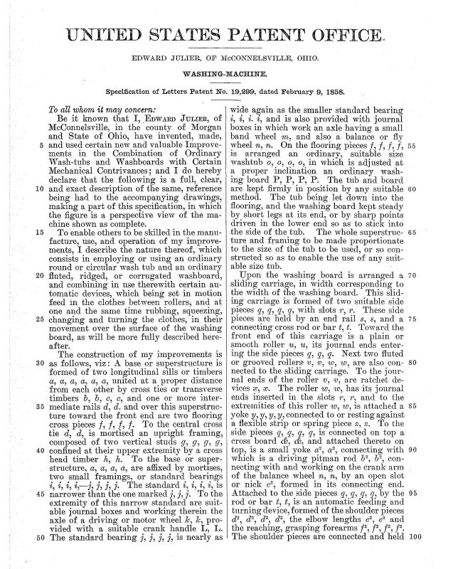 Patent issued to Edward Julier of McConnelsville, OH February 9, 1858 No. 19299