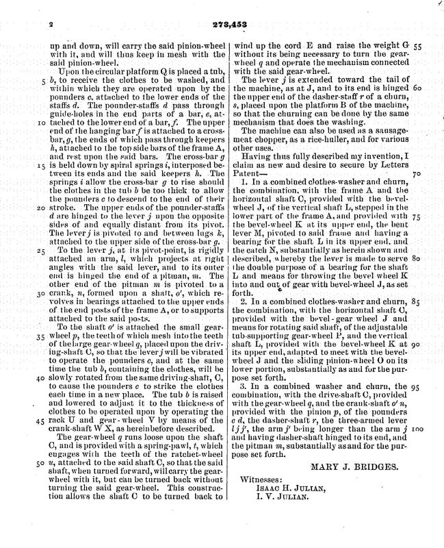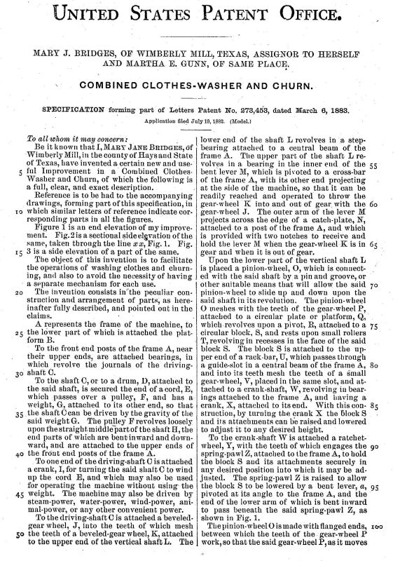 US patent 273453 issued to Mary J. Bridges of Wimberly Mill, Texas March 6, 1883