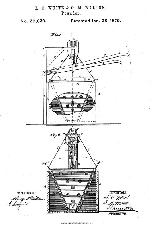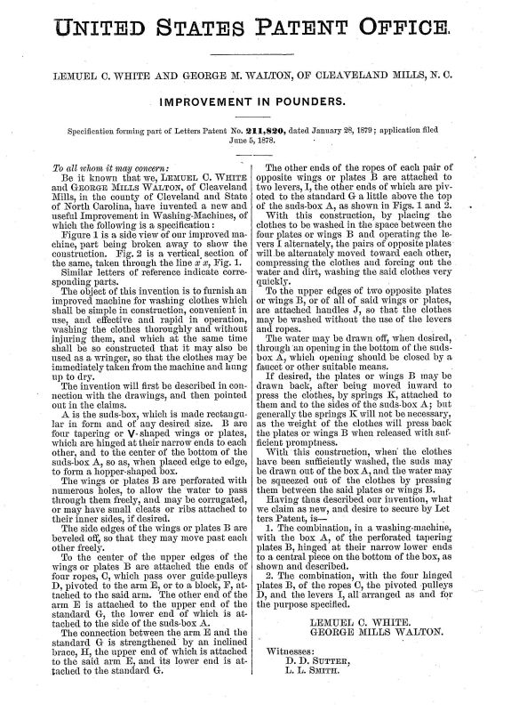 Patent issued Jan. 28, 1879 to Lemuel C. White & George M. Walton of Cleveland Mills, NC. US Pat. No. 211820