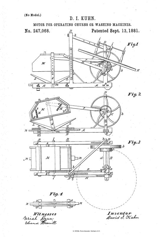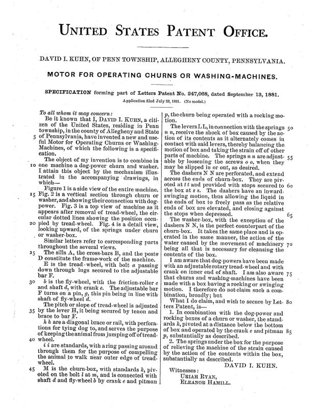 Patent title: Motor for operating churns or washing machines. US Pat. 247068 Patent issued to David L. Kuhn of Penn Township, Allegheny County, PA Sept. 13, 188