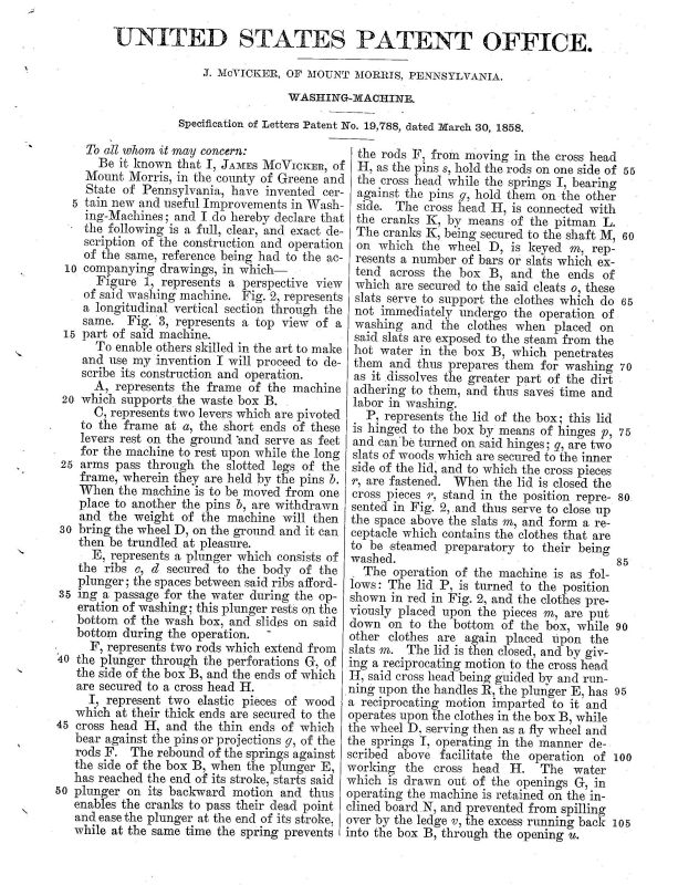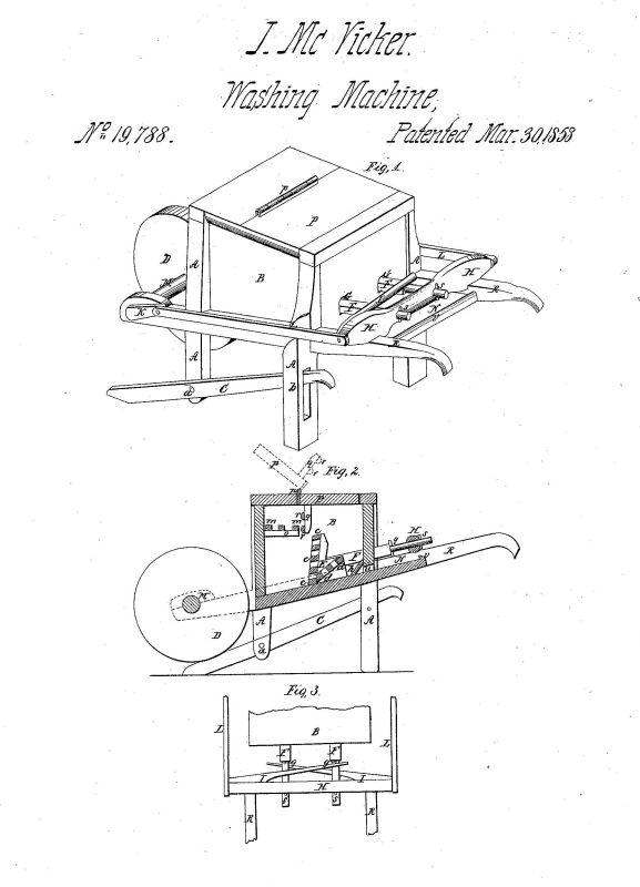 Patent 19788 issued to James McVicker of Mount Morris, PA March 30, 1858 Powered by pushing around like a wheel barrow.