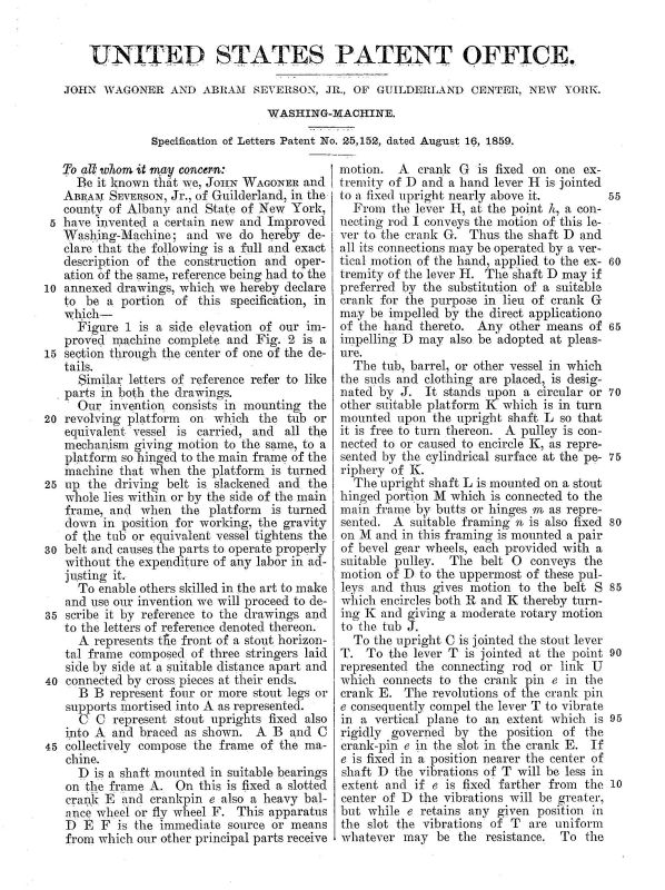 Patent 25152 issued August 16, 1859 to John Wagoner and Abram Severson, JR of Guilderland Center, New York