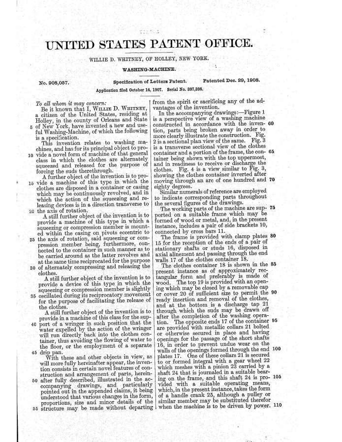 Willie D. Whitney of Holley, NY was issued this patent on December 29, 1908