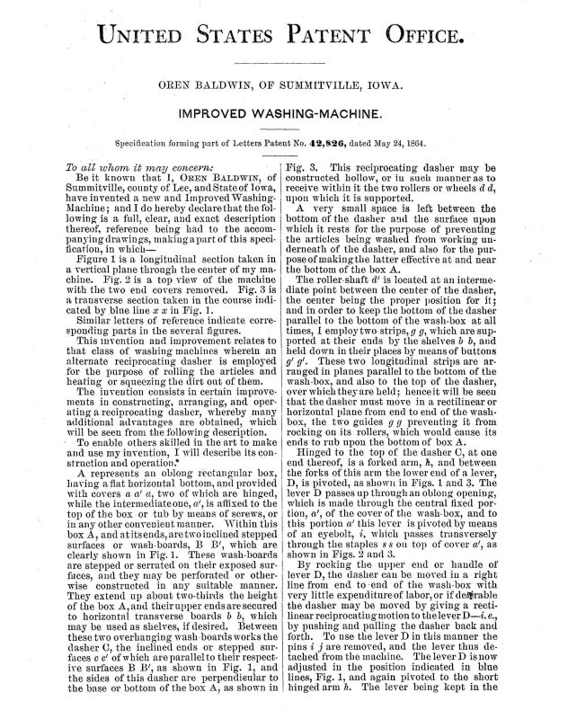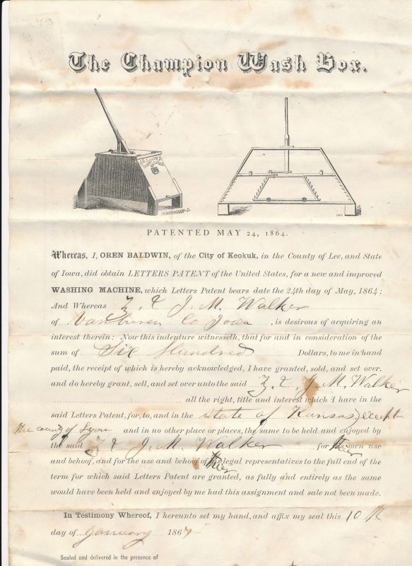 Oren Baldwin of Summitville, Iowa was issued a patent for this washer on May 24, 1864. On January 10, 1867 he sold a regional patent right to Z L & J M Walker for $600. The Walkers could manufacture and sell the machine in all of Kansas except Lyons County. The machine was given the model name "The Champion Wash Box. The tub was redesigned. See ID 1573 for the redesigned tub. |