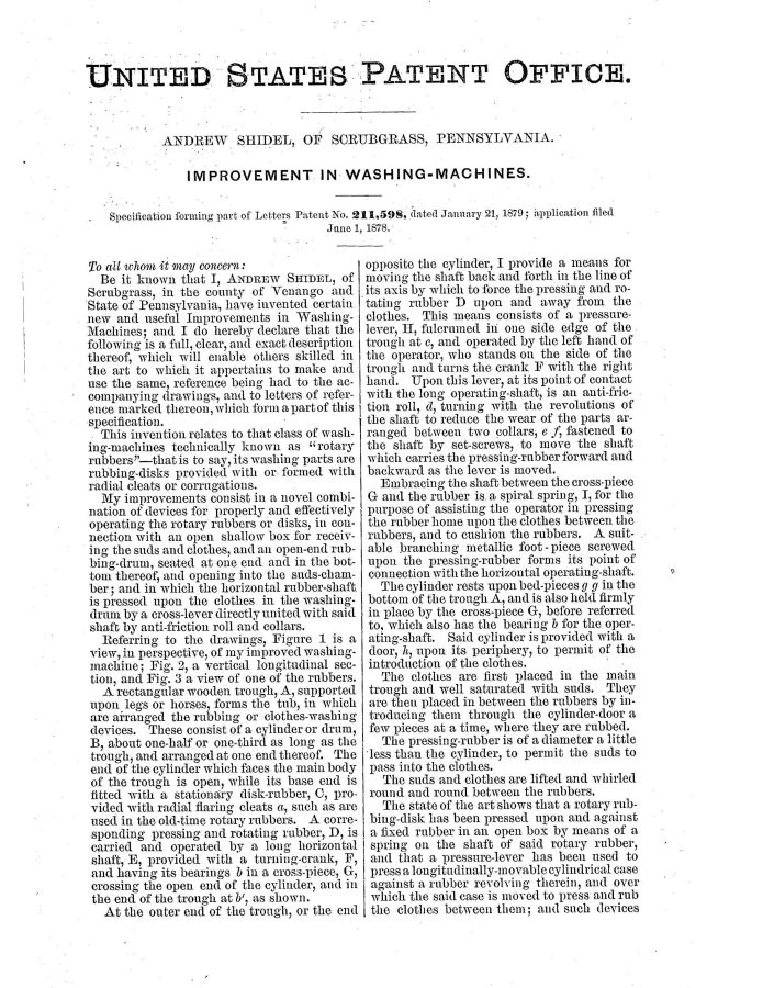 Andrew Shidel of Scrubgrass, Pennsylvania was awarded patent 211598 on January 21, 1870 for this machine.