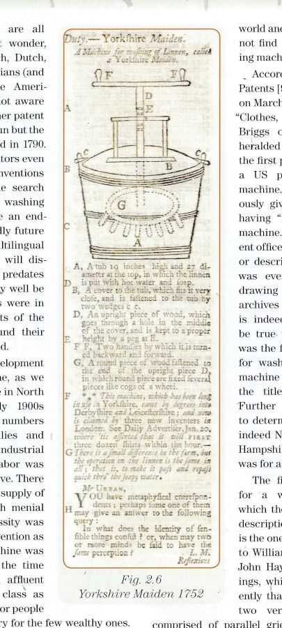 This is a model of a washing machine manufactured in 1752 in the UK. This is the earliest washer which has been found,by this museum, that has "moving parts" but there must be others. Ref. Jan. 1752 issue of The Gentleman's Magazine, pp.32 London UK |