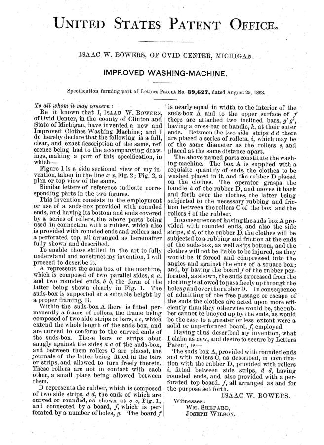 Isaac W. Bowers of Ovid Center, Michigan was issued the patent for this machine on August 25, 1863. Patent number 39627
