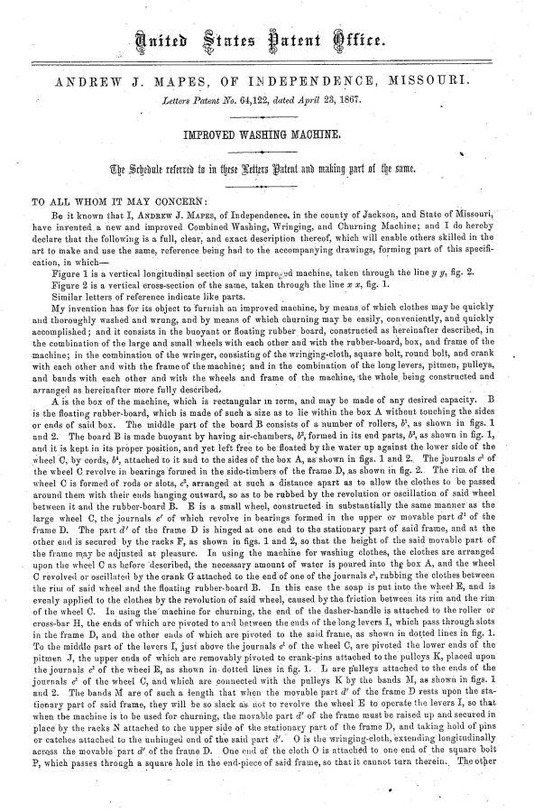 Andrew J. Mapes of Independence, Missouri was granted the patent for this machine on April 23, 1867