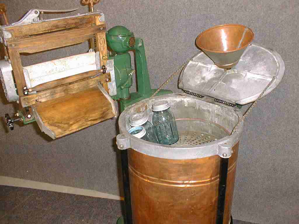 Vacuum washer, single cone, copper tub, electric motor, gas heater attached, used for washing and canning fruit and vegetables