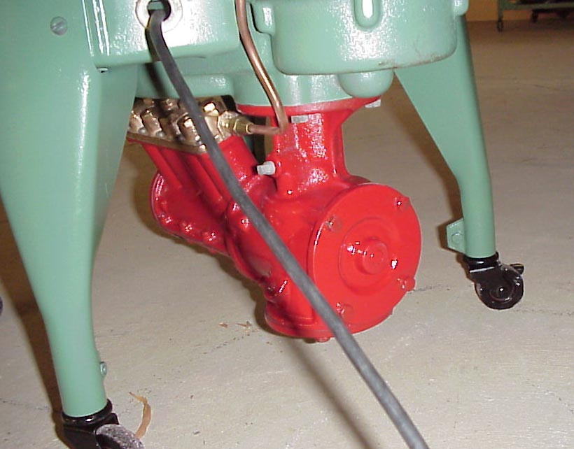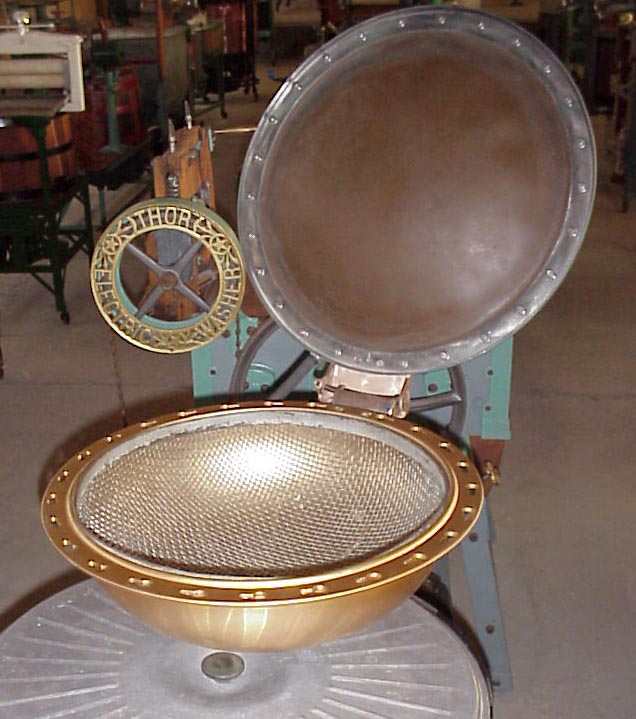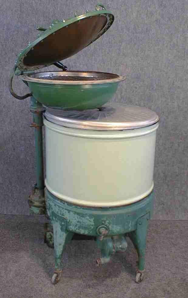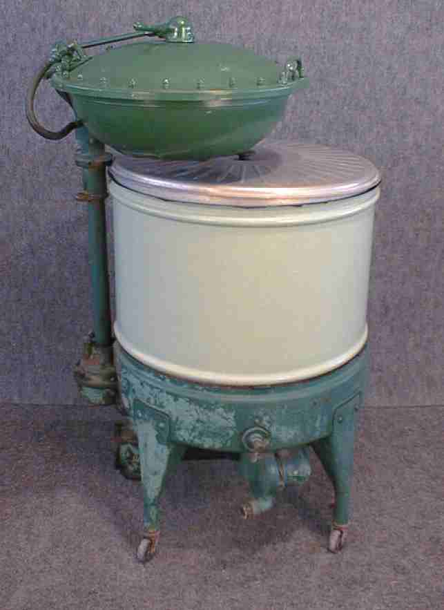 Gyrator washer, green porcelain tub, electric motor, with clam shell winger. Diaphragm of clam shell is inflated by an air compressor built onto the machine.
