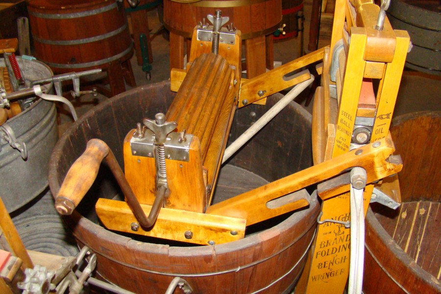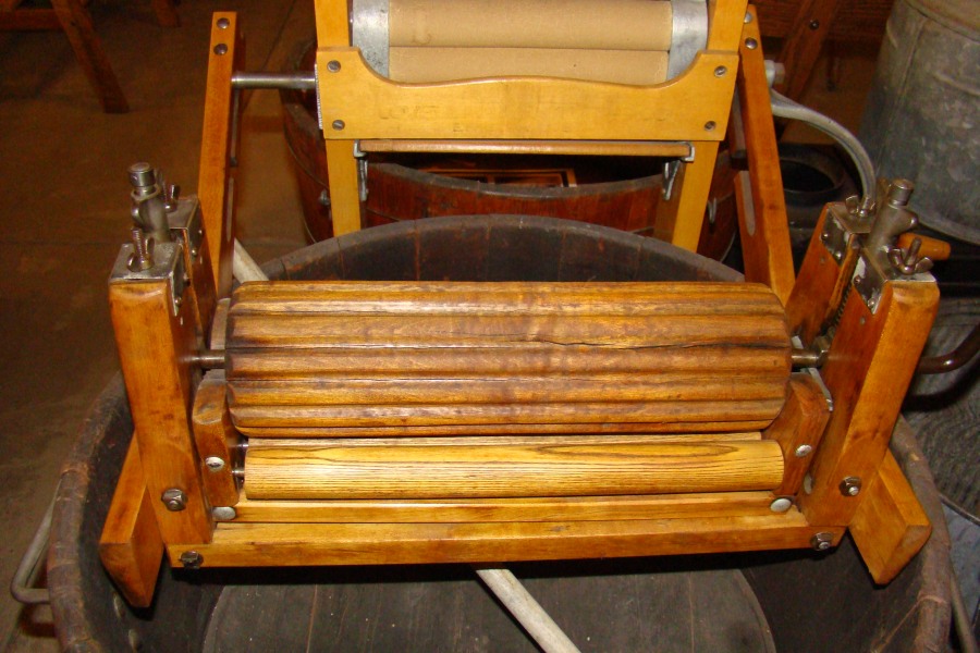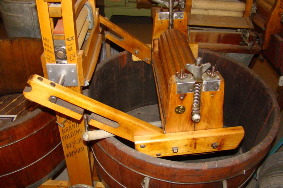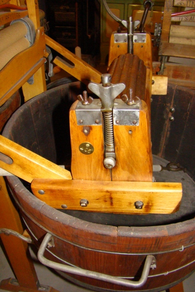 The washer is mounted on a wringer bench produced by Lovell Wringer Co. Erie, PA