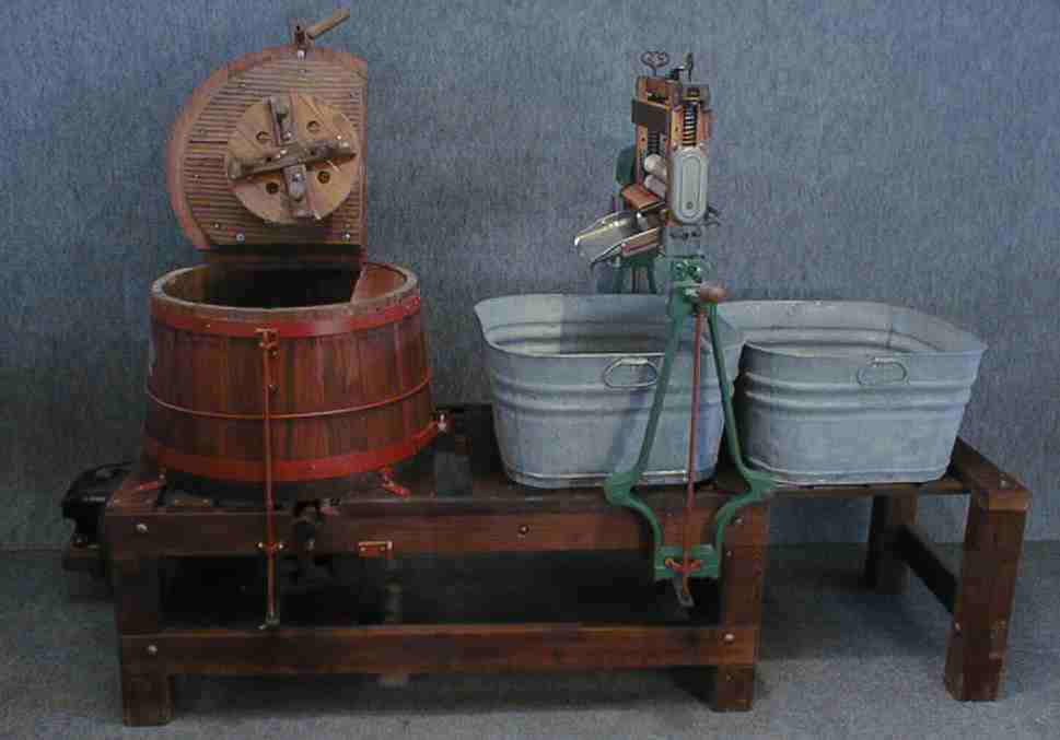 Dolly washer, wooden tub, electric motor, wringer on trolley