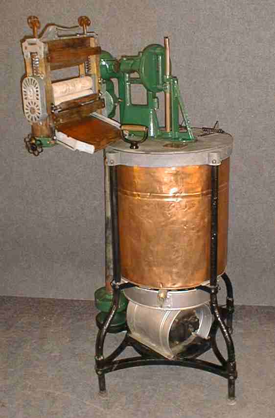| Description: | Vacuum washer, single cone, copper tub, electric motor, gas heater attached, used for washing and canning fruit and vegetables | |