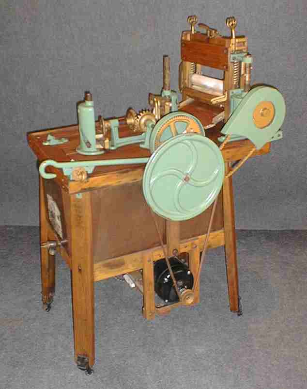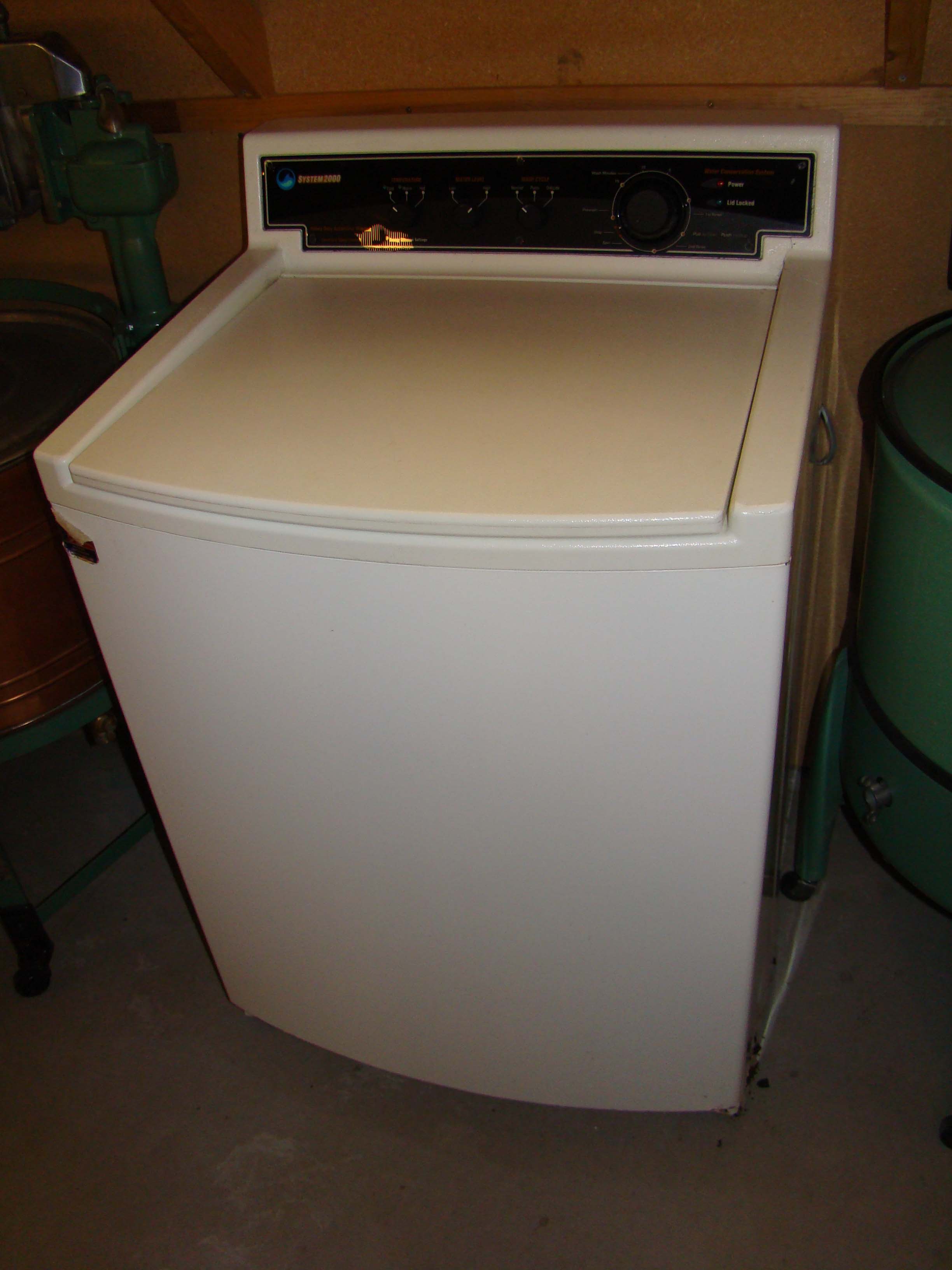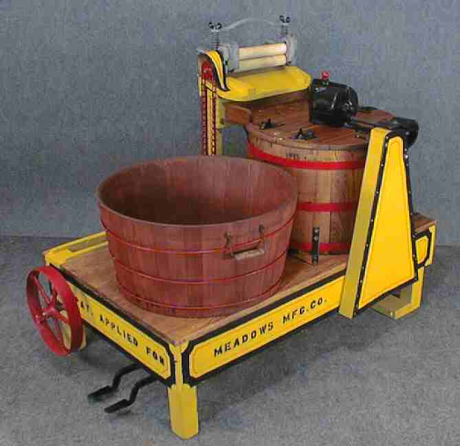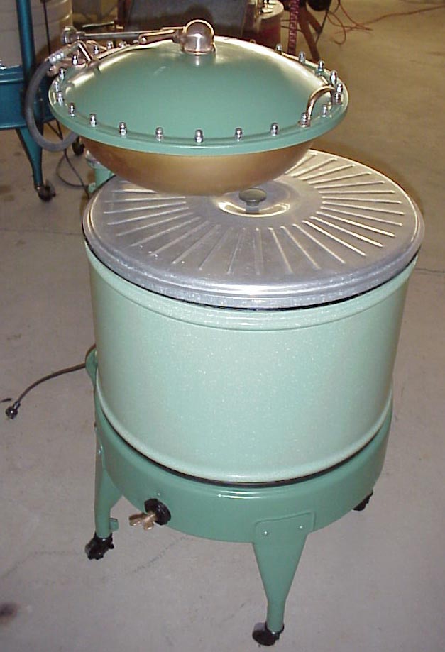 | Description: | Gyrator washer, green porcelain tub, electric motor, with clam shell winger. Diaphragm of clam shell is inflated by an air compressor built onto the machine. | |
