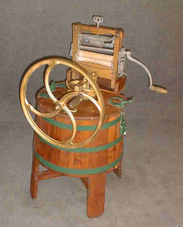 | Description: | Dolly washer, wooden tub, hand operated, has double rack and pinion gears | |