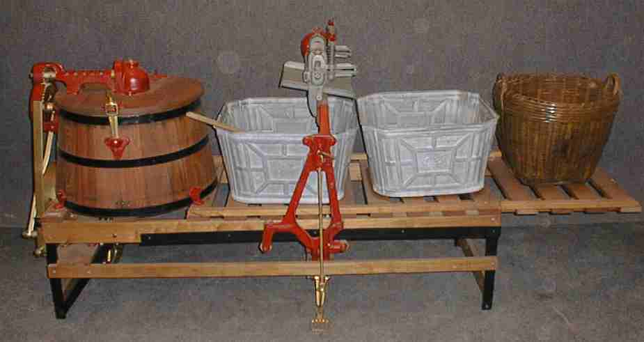 | Description: | Dolly washer, wooden tub with 6' base, belt driven, wringer slides along base | |