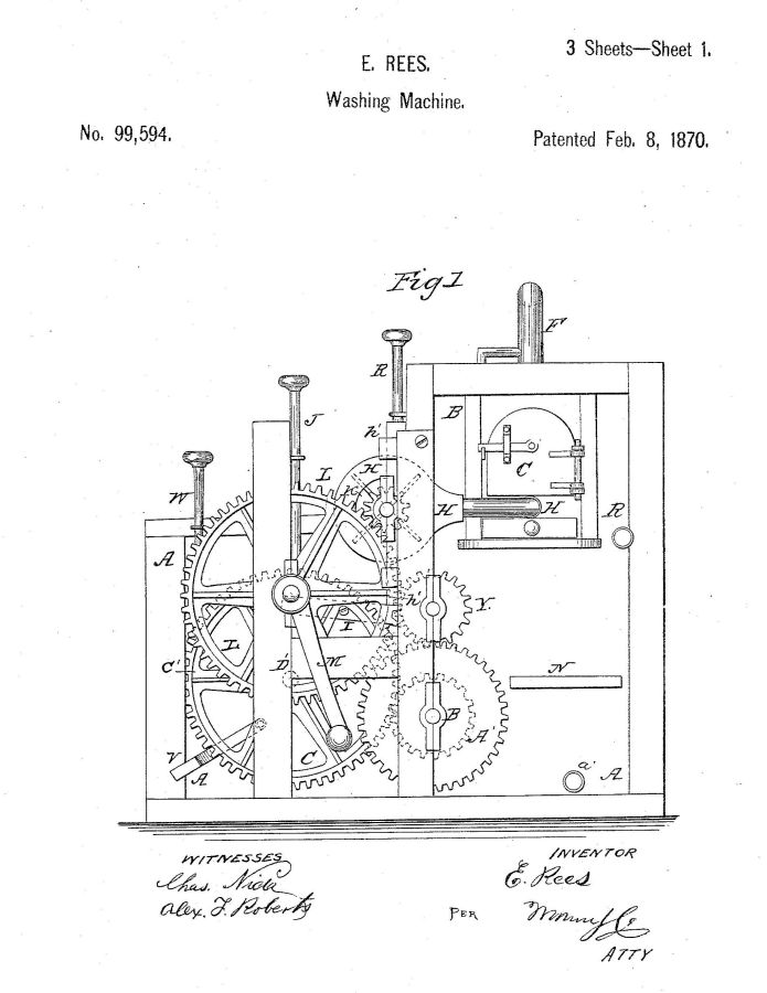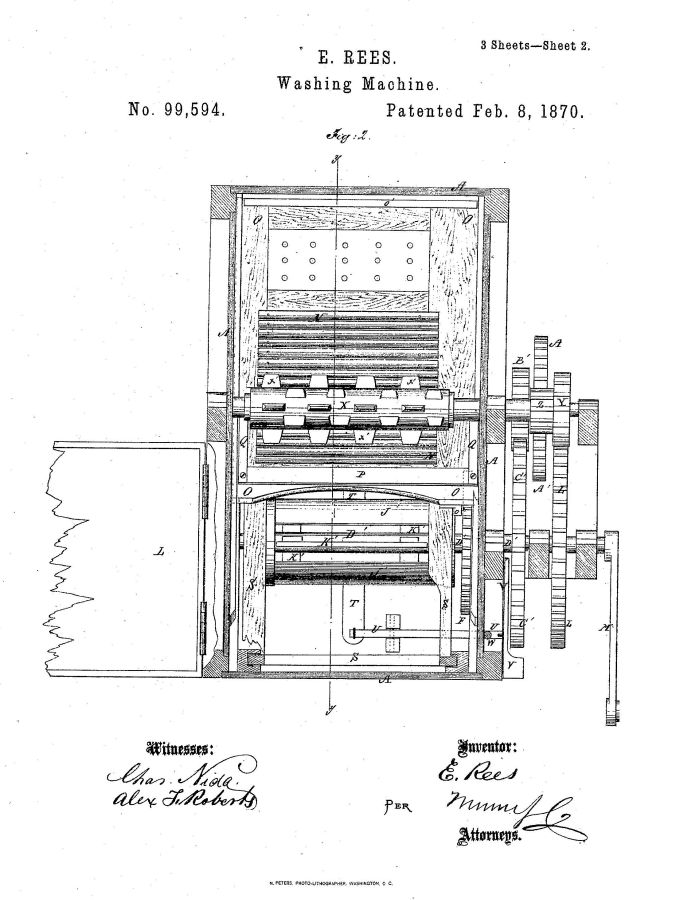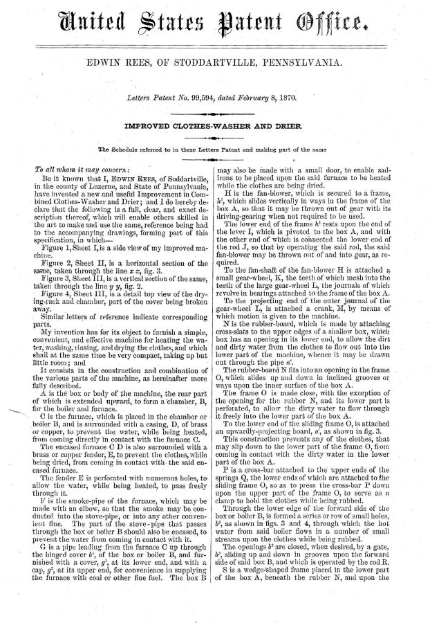 Edwin Rees of Stoddartville, Pennsylvania was awarded US Patent 99594 on February 8, 1870 for this machine. It is a washer, rinser and dryer. This patent demo took 3 months of fun to build.