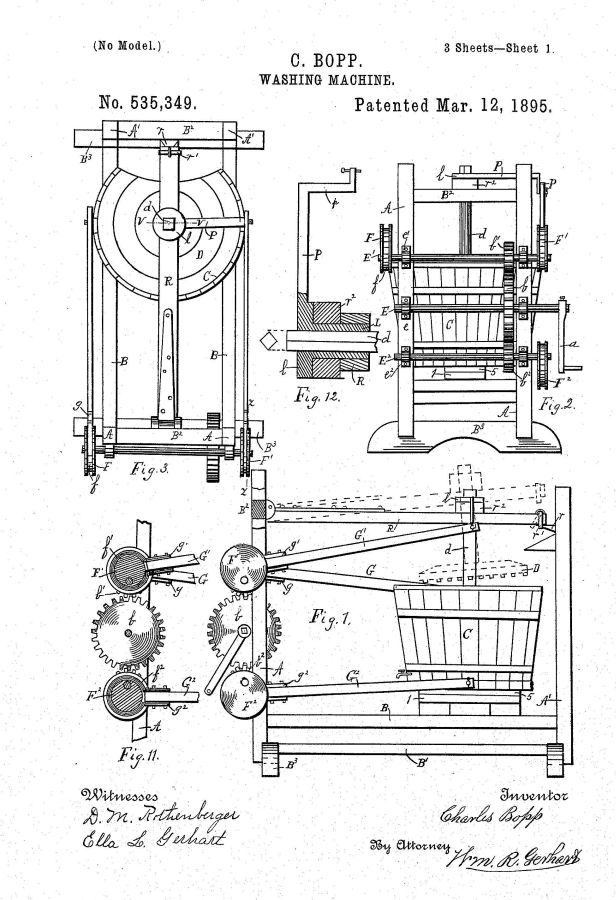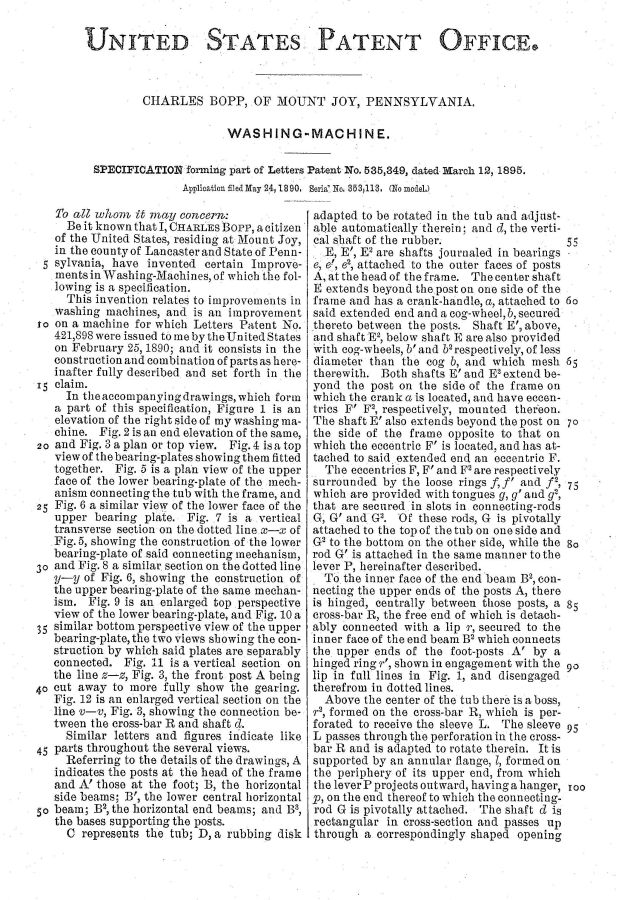 Charles Bopp of Mount Joy, Pennsylvania was issued the patent for this machine on March 12, 1895. He has an earlier patent for a similar machine.